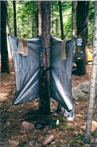 Figure 3 – Propane shower with privacy screen, towels, mirror, toiletry roll, battery powered pump, and 3 gallons of water in (2) 6-liter Platypus water bladders.