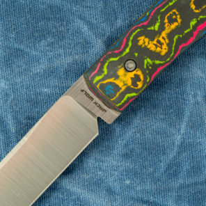 The arcing handle, with its flared, heavy butt end, is just as emblematic to sodbuster history as its blade, and of course it’s been carried forward here on the Pioneer FixEDC. Hold it any way you want, this profile will accommodate. As per usual, Jack Wolf has gone wild with the handle materials, with some extremely eye-catching variants on this premium piece; shoutout to the 80s Camo Carbon with its retro action movie look in particular.
