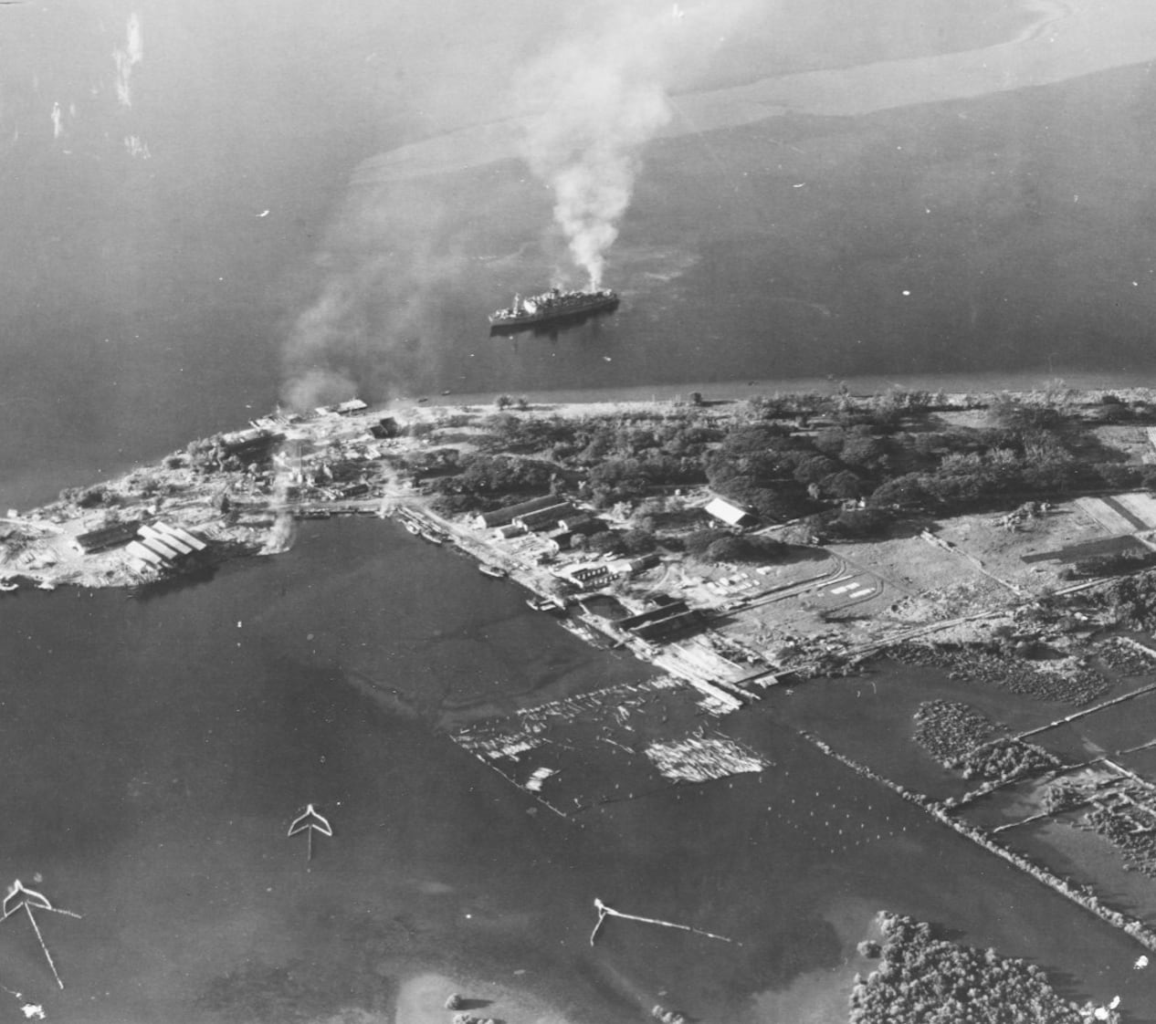 Aerial photo taken from a USS Hancock (CV-19) plane showing the sinking of the Japanese ship Oryoku Maru off the coast of Luzon, Dec. 15, 1944. (Naval History and Heritage Command)