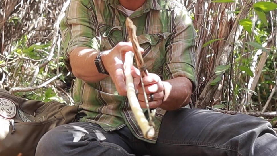 5. String the Bow – For the primitive bow string, a leather thong was used when available. Leather was stretched tight because it is somewhat elastic. If you string the bow with a bootlace or modern cordage without much stretch, it will not need to be as tight. A trick I learned from David Holladay was that if you don’t have any cordage, you can tear the bottom seam from a t-shirt and braid cordage from that. You can also braid a string from plant fibers, rawhide, catgut or sinew. Tie the string loosely to the bow and then twist the spindle into place. It may take a couple of tries to get the tension right.