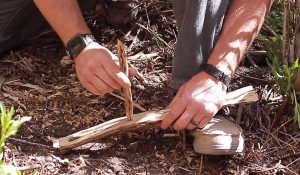 1. Collect Materials – One could write an entire chapter just on bow drill materials and which species are suitable for bow drills or hand drill spindles or hearth boars. The main things that you need to know are that the wood can’t be too hard or it will glaze and never develop an ember, and that all materials should be bone dry. The materials for the hearth board, spindle, and bow can come from the same dead branch as long as the wood isn’t too hard and it is sufficiently dry.
