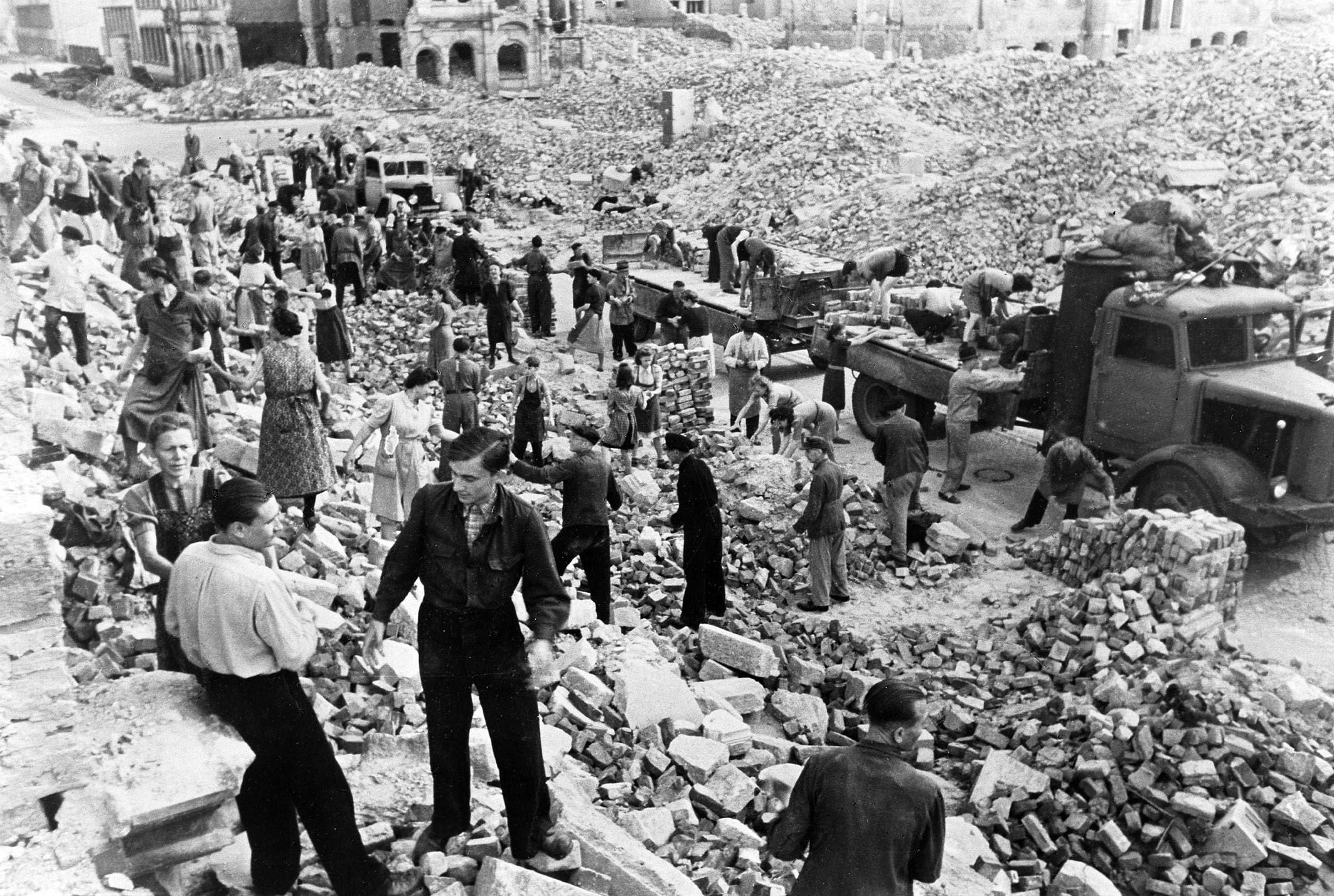 Dresden residents and emergency personnel cleaning up the rubble following the February 1945 Allied bombings. (Richard Peter/Getty Images)