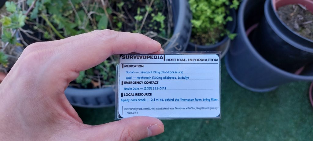 A family emergency card should be updated just like the rest of your preparedness plan. If you move, change churches, switch schools, update medications, or lose a key contact, the card should change too.